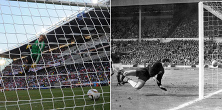 Lance lembrou o clássico gol da Inglaterra na final da Copa de 1966, diante da Alemanha (foto acima). A polêmica era a mesma: a bola entrou ou não? Mas, à época, não havia 32 câmeras em Wembley, e o gol validado ajudou os ingleses a erguerem a taça.
